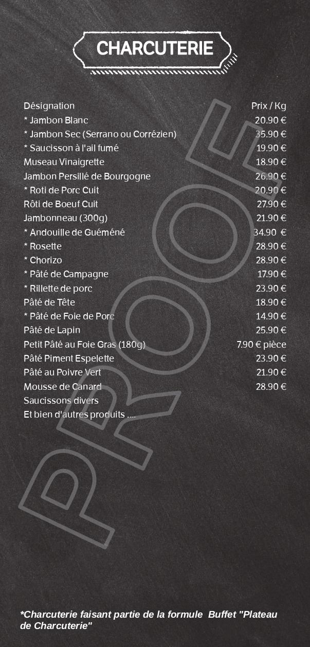 -Jambons cuit et sec, saucissons et saucisses sèches, pâtés et terrines, andouilles, autres charcuteries sèches (bacon, coppa, viande des grisons), etc...